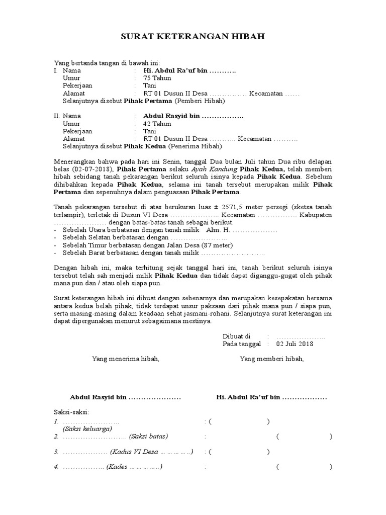 15 contoh surat permohonan kerjasama bantuan. Di bawah ini ada contoh surat keterangan hibah tanah yang bisa anda jadikan referensi untuk keperluan anda. Jika ingin menghibahkan suatu harta, maka. Emas juga merupakan salah satu aset yang kerap dihibahkan kepada anak atau kerabat. Membuat surat keterangan waris yang ditanda tangani oleh para ahli waris dengan diberi materai min.